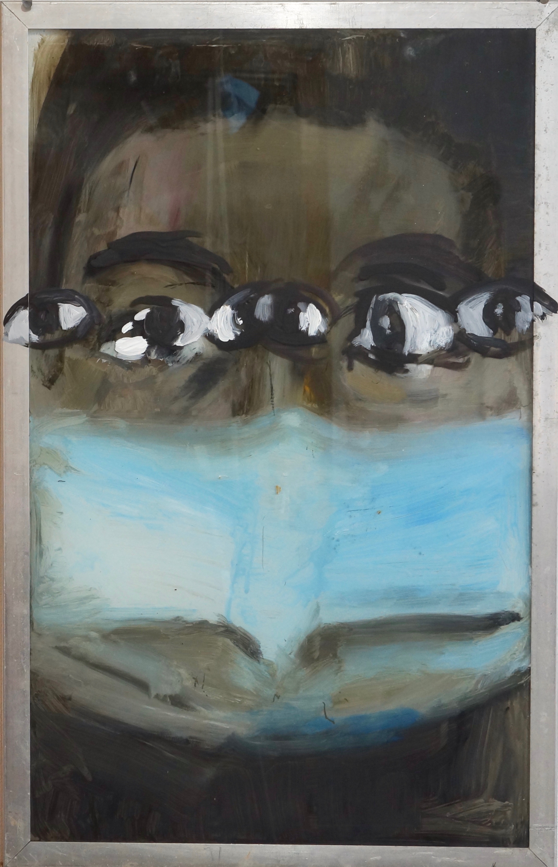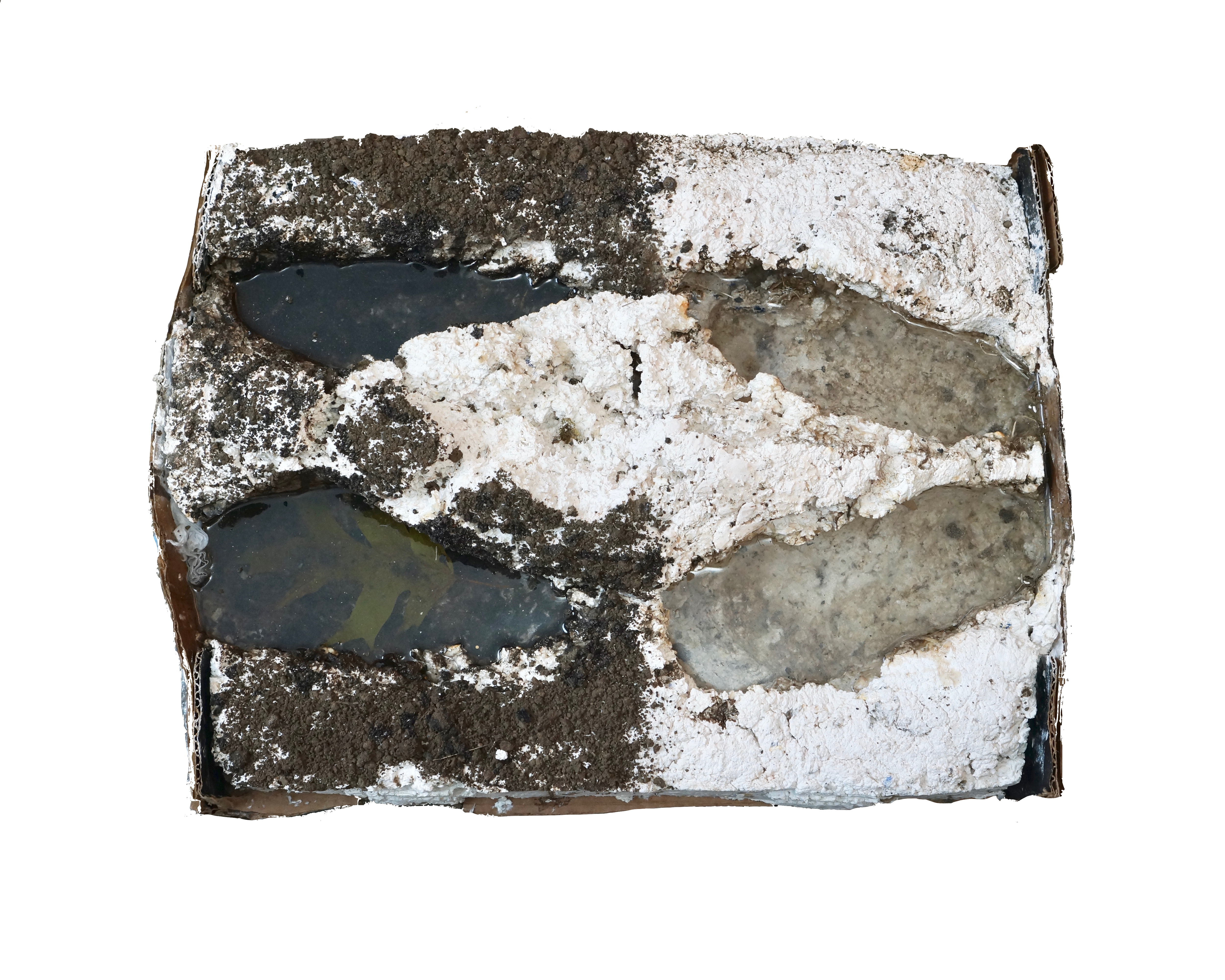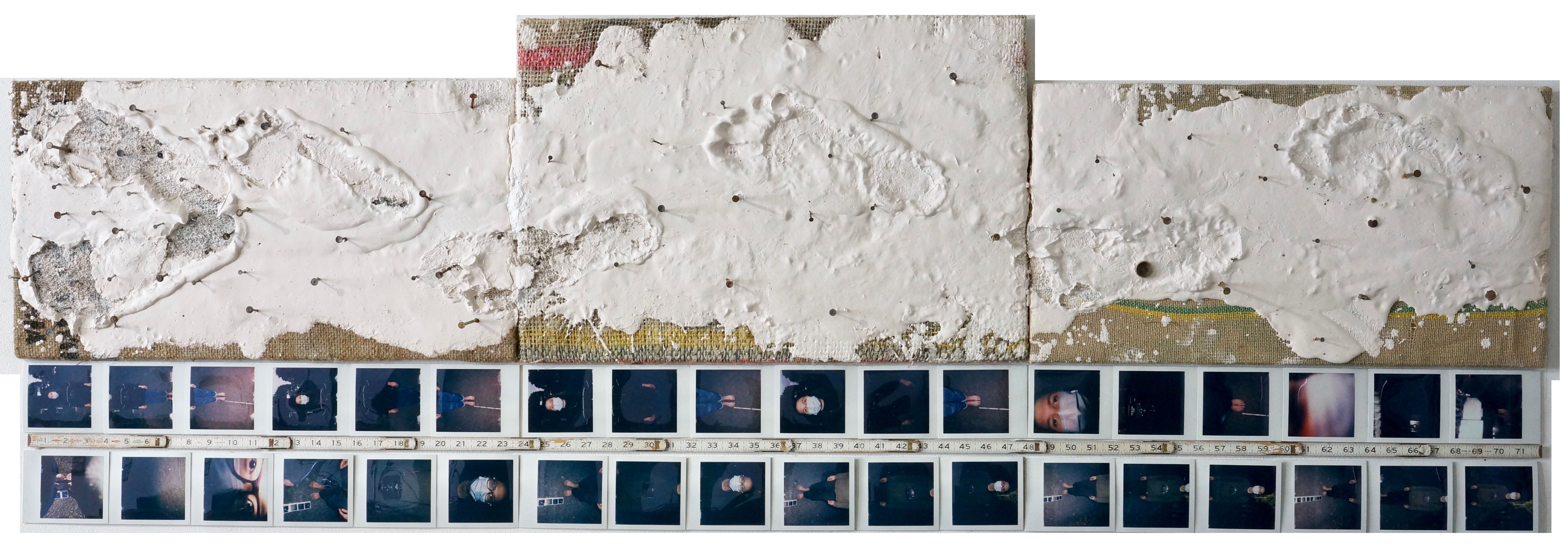 Six Feet 72 x 23.5 in plaster and nails on burlap bags stretched on wooden panel; Polaroid photos mounted on paper, ruler